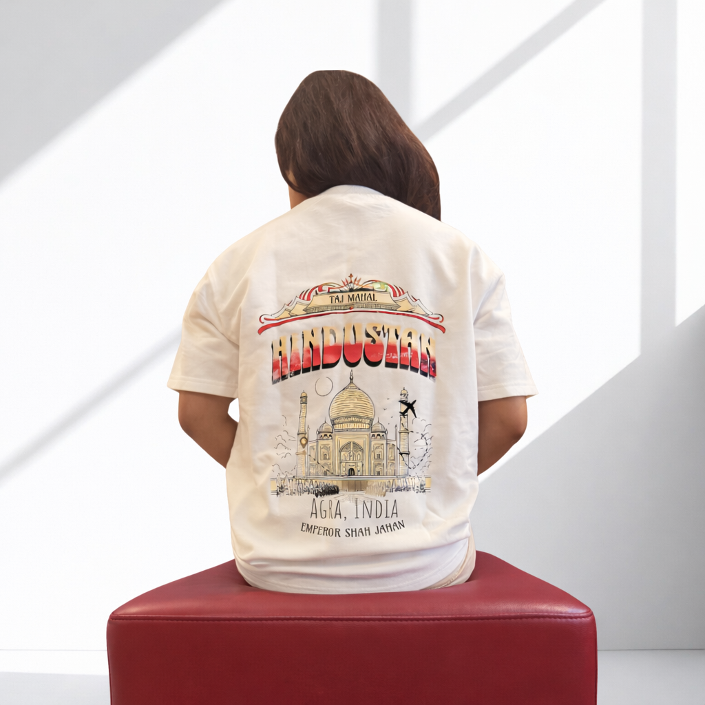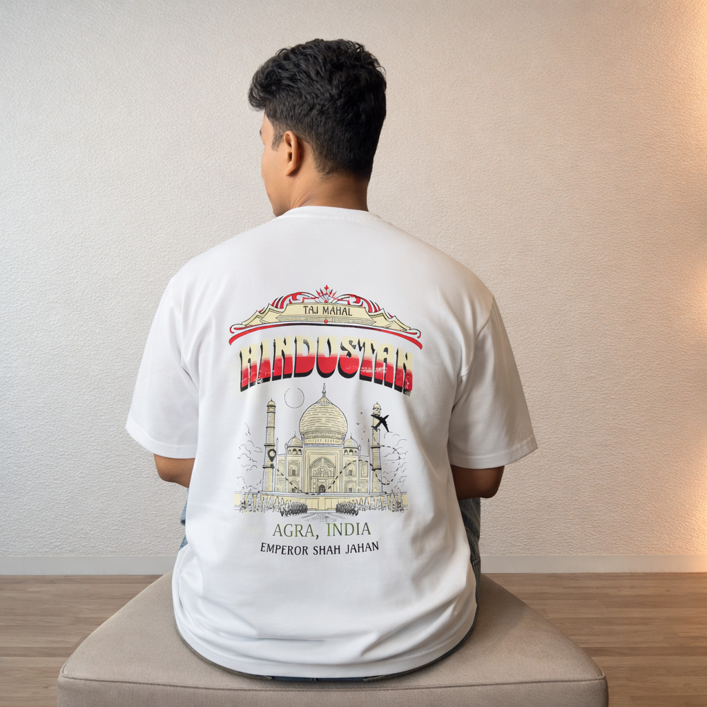 A modern tribute to Hindustan. Clean from the front, iconic from the back — inspired by Agra, travel, and timeless Indian identity